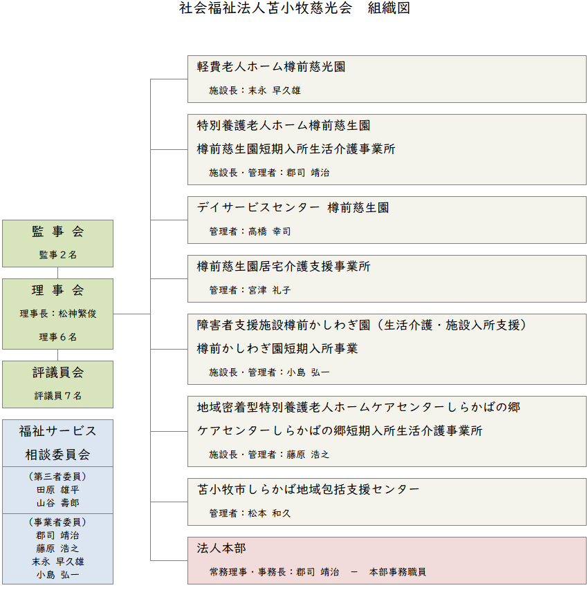 社会福祉法人 苫小牧慈光会は、初代理事長である郡司徳男師を中心とする同士が相集い、静寂にして風光明媚な樽前の地を老人や障害者の福祉の楽園、いわゆる福祉村の建設と高邁な理想を掲げ、昭和40年以来着々と準備を進め、軽費老人ホーム、特別養護老人ホーム、デイサービスセンター、障害者支援施設、介護保険法並びに障害者総合支援法に基づく短期入所事業や居宅介護支援事業所、苫小牧市の委託による地域包括支援センター等々を運営、今日まで、老人福祉、介護保険制度、障害者福祉制度のもと、老人・障害者等に対する各種援助と地域福祉への貢献を目指し活動している。